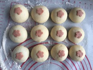 用梅花模具摁成12朵小梅花 粘到奶黄包胚子上