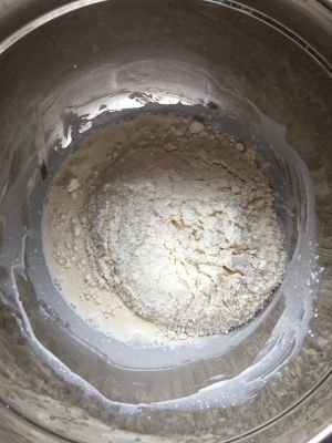 在搅拌好的牛奶酵母溶液中倒入中筋面粉 (如果追求完美可以筛网过一遍)