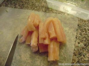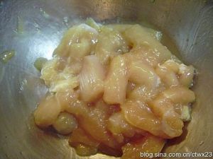 鸡柳切好后,放入碗中,加入半个鸡蛋、盐、味精、白胡椒粉、麻油、淀粉捏到所有的材料都被鸡柳吸收待用