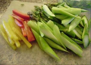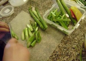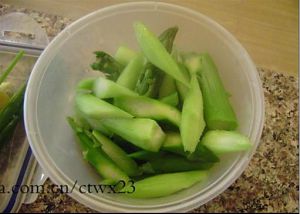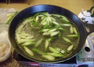 锅中加水,烧开,放入芦笋,加一小勺盐,五六滴油煮开半分钟