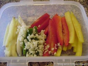 红黄椒切丝,葱切段,姜切丝,大蒜切末备用