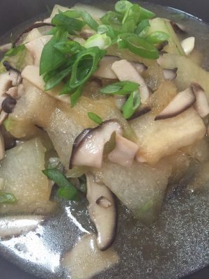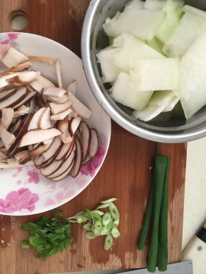 材料准备好。香菇 冬瓜洗净切片 小葱 葱白和葱叶分开切 大蒜切碎