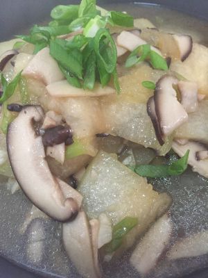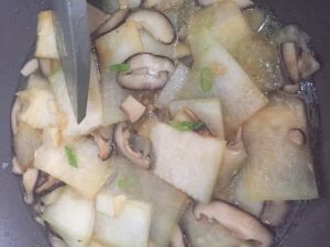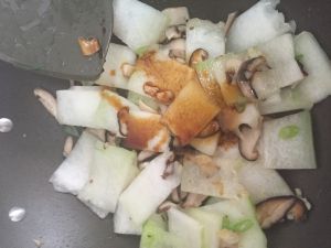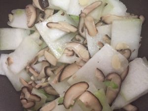 倒进去冬瓜片 翻炒。一直是小火哟。翻炒以后盖盖子 焖 这是为了不浪费香菇汁的香味 融到冬瓜里 香香的 闷着几分钟 冬瓜软了