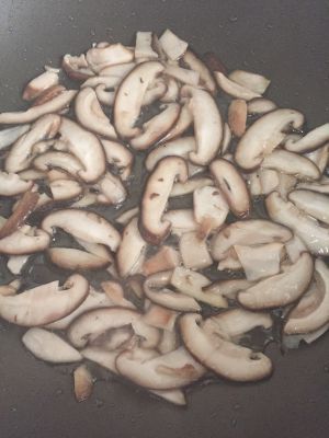 热锅倒油 油热转小火 倒入香菇片 翻匀盖盖子焖香 这个时候香菇会出水 散发各种香味...