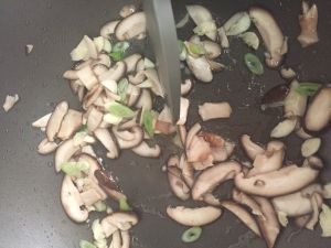 焖了几分钟的香菇已经软了而且出了很多汁 再把葱白和蒜末倒进去微炒 炒到蒜和葱很香的时候就好