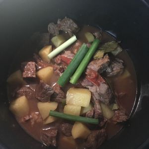 锅中倒油,花椒八角炒香,下入姜片,葱。