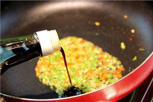 锅里放入少许油,将切好的青红椒末入锅煸炒,这个时候油温不能太高,以免破坏青红椒的颜色,略微煸炒到出来淡黄色了就可以。