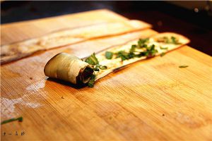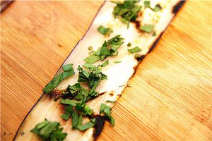 将撒好九层塔的茄子片卷起来,九层塔的香味开始弥漫开来....