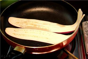 将茄子片放入平底锅两面煎至焦黄,记得要全部煎过。