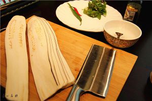 将茄子洗净,顺长条横切成为长条薄片,如果切不了的,可以用大些的刨刀刨成薄片。这个时候可能会稍微有些考验刀工,其实静下心,慢慢切,你会发现你也可以做的非常好。我相信任何事情想到想好了就要动手去做。