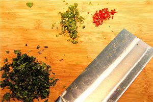 然后将九层塔切碎,九层塔可能对于我们中国人还比较陌生,它常常被应用在西餐里面,是一种香料,类似我们的香菜,喜欢的人非常喜欢,不喜欢的说它是臭的。青红椒个切细丁备用。