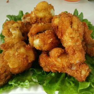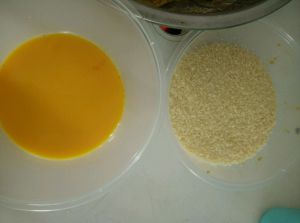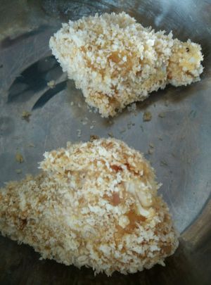将腌好的鸡腿在蛋液里裹一圈再在面包糠里裹一圈,就成这样了。锅里烧油,油冒烟就下锅,鸡腿变色改小火!