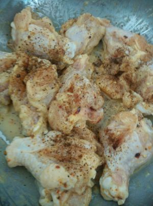 鸡腿洗干净,肉多的地方划两刀。腌料和均匀腌制半小时,我里面加了点辣椒面,花椒面,腌料是在超市买的。