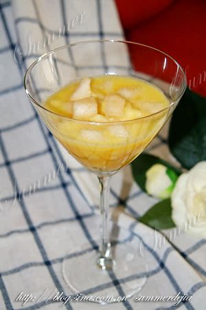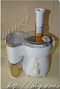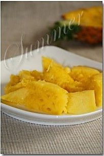 将菠萝块放入榨汁机中榨汁,并入入两勺蜂蜜拌匀;