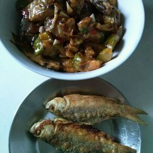 4.锅里油烧热,放花椒炸香,放葱,姜,蒜,炒香,下入鲶鱼段翻炒断生,放辣椒,放豆瓣酱炒出红油,加入煎过的茄子翻炒一下,倒入调好的糖醋汁稍微翻炒两下,撒上少许葱丝,蒜粒,少许盐,出锅。