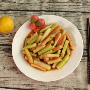 你可以将家人吃完的西瓜处理干净后,将绿皮刨掉再切成条。西瓜皮可以少留一点红瓤,不但美观吃起来还有一丝甜甜的味道