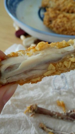 把鸡翅裹上淀粉,放鸡蛋液里面糊一层鸡蛋液,再放到方便面碎里面裹一层。(没有面包糠,只能用方便面砸碎,代替面包糠了)