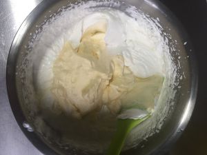 在将初步拌好的蛋黄酱加入到淡奶油的大盆中