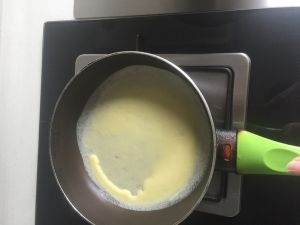 待锅烧热,取一勺面糊,摊成圆形的皮
