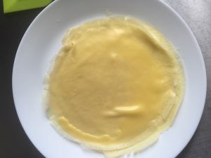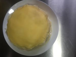 取一大盘,盛装饼皮,摊好的饼皮,晾凉备用(这个方子里面的,可以摊15张左右)
