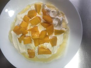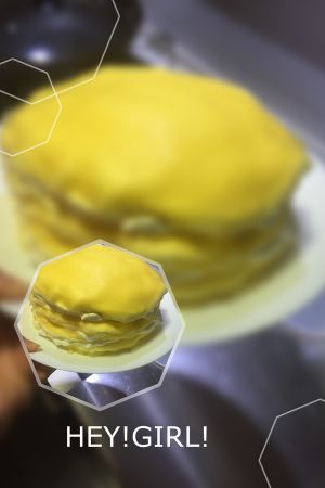 铺一层饼皮,铺一层奶油,撒上芒果粒,再铺一层饼皮,铺一层奶油,铺一层饼皮,再一层奶油,一层芒果(我喜欢饼皮多一些,所以一般是2层皮,一层芒果)