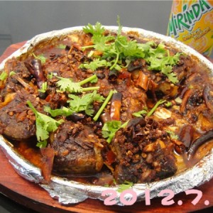 锅热油,放入花椒30到40粒左右、干辣椒7个爆香,放入蒜瓣(多放)炒香,放入三勺豆瓣酱(根据个人口味增减)炒出红油,倒入1杯开水,待汤汁浓厚均匀地浇在鱼块上,接着烤15分钟。最后撒上香菜即可!