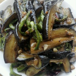 过好油的茄子豇豆扔进去翻炒片刻 倒入生抽 耗油