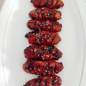 最后装盘是撒上一点小芝麻!很好看喔!这样下来鸡翅很入味,咬在口里肉很嫩,粘在嘴唇上的汁回味无穷,男女老少皆宜!