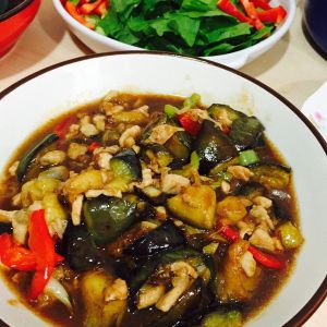 肉熟了之后下茄子块和青红椒丝略炒,之后放调味料出锅!