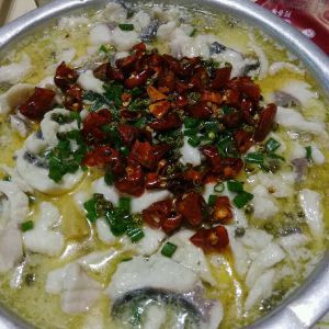 煮鱼汤, 锅里倒油,葱姜蒜炒香,放入切碎的酸菜,小米辣,加水,水烧开放入鱼骨,炖20分钟,别忘了放盐,水开后尝一下