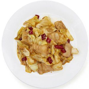 锅中留底油30克,将干椒段放入,小火炒出香味后放入包菜,翻炒至半熟后,放入五花肉翻炒;