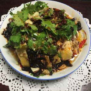 把花生碎香菜码放在切好的鸡上面,撒上芝麻,倒入调制的酱汁,最后把花椒面和油调和的烫的花椒油倒入鸡里面即可(我放了点香菇酱提味)。