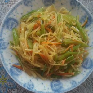 热油锅,放入葱蒜,胡萝卜丝,芹菜,土豆,翻炒!土豆变软后,放盐,味素出锅。简单美味!
