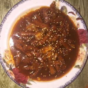 锅中留底油,放入番茄酱炒一下,然后倒入酱油,醋,白糖,水淀粉,熬制粘稠后将炸好的里脊倒入锅中翻炒一会盛出来即可,可以在里脊上撒一点芝麻