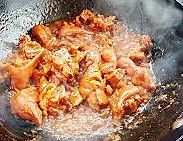 锅内烧热油,放入沥干水份的猪蹄翻炒1分钟,加入两大匙腐乳汁翻炒均匀。
