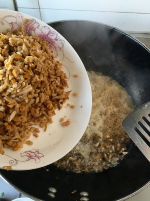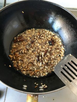 油,放大料和桂皮炒香,大料和桂皮是一比三的量,放入香菇炒炒,立即放香菇水。放少许白糖,鸡粉,味精