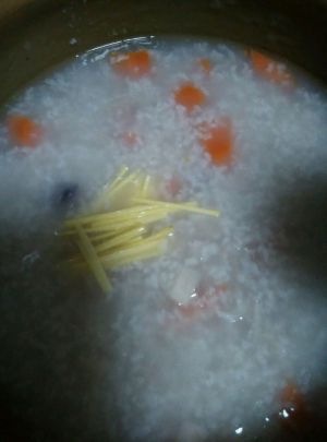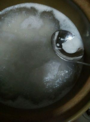 先煲粥,滚开后有白沫,记得用勺子舀掉,煲20分钟,中火
