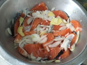 三文鱼切片,用盐,姜片,洋葱腌制半小时