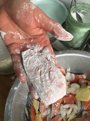 三文鱼裹一层淀粉,放入油锅煎