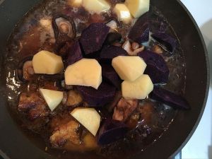 加入适量开水和土豆再次烧开锅。然后转入高压锅压35-45分钟。软烂程度根据个人口感而定。