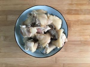 两个猪脚剁成大块后开水里焯2分钟去掉血沫子,捞出沥水备用。