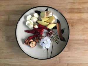然后倒入盘子里的全部香料:姜蒜、花椒大料、辣椒、桂皮、干山楂、小茴香籽继续翻炒2分钟,炒出香料的香味。