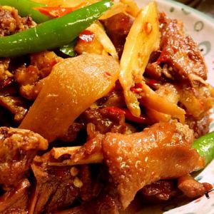 油烧热,放花椒、鸭肉下锅爆炒至鸭肉表皮金黄,爆炒时可以加入大蒜一起
