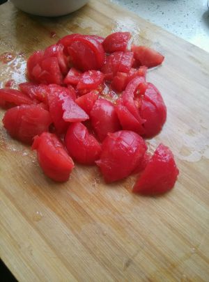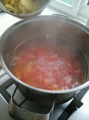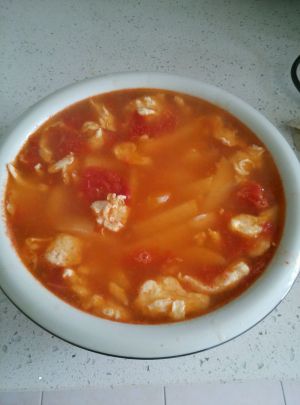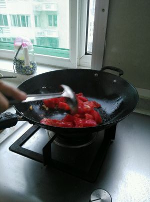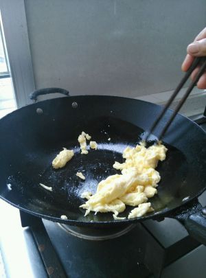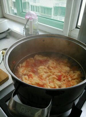 把炒好的鸡蛋和西红柿倒入煮土豆的锅。等待土豆煮熟。
