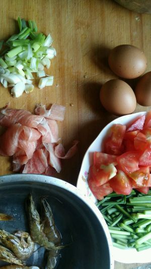 葱切小段,虾洗净,西红柿切小块,韭菜苔切五厘米小段,肉