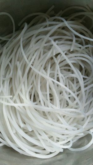 买的干土豆粉,放在水里浸泡两小时,捞出来,切成30厘米左右的长短,切短方便食用