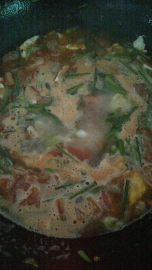 开始做卤了,加点食用油,烧热后,放入葱煸香,加肉,肉熟加入韭菜苔,炒两分钟,放入西红柿,3g盐,一个鸡蛋打散加入,加刚没过菜的水煮沸