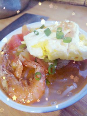 捞出土豆粉,加入菜卤,虾,煎蛋,这样就可以食用啦,另外喜欢其他调味料的可以自行添加