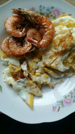 盛出鸡蛋后,放入虾,可以去头,也可以不去,加一点点盐煎熟,盛出备用