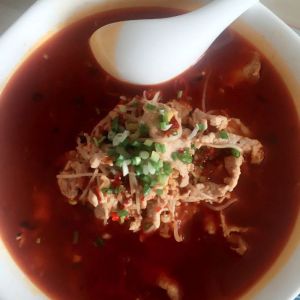 9、炒好配料后,加入清水(锅的五分之二),水开后,迅速用筷子挑肉下锅,注意把肉挑散,肉全下完后大火煮一分钟;下入金针菇,豆芽,两分钟后关火。